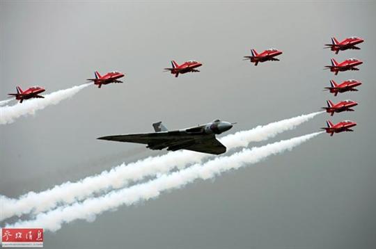 7月9日,在英國南部小城范堡羅,英國紅箭飛行隊和一架火神轟炸機在范堡羅航展上進行開幕表演。來源:參考消息