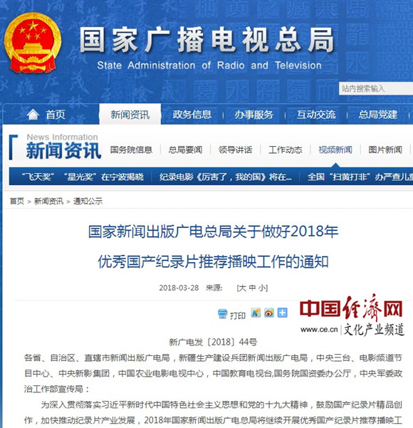 廣電總局:做好2018年優秀國產紀錄片推薦播映工作