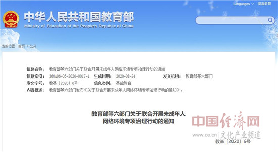 教育部等六部門關于聯合開展未成年人網絡環境專項治理行動的通知