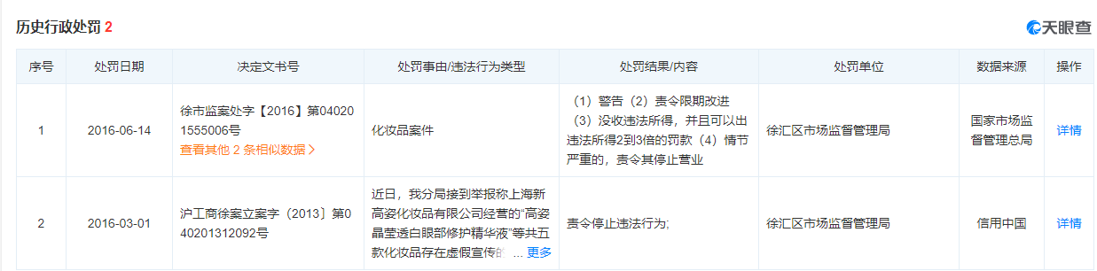 據(jù)天眼查,上海新高姿化妝品有限公司曾有兩次歷史行政處罰記錄,一次因添加了未經(jīng)審批的配方被警告,并沒收違法所得;一次因虛假宣傳,違反了《中華人民共和國(guó)反不正當(dāng)競(jìng)爭(zhēng)法》《上海市反不正當(dāng)競(jìng)爭(zhēng)條例》等相關(guān)法律被責(zé)令停止違法行為。
