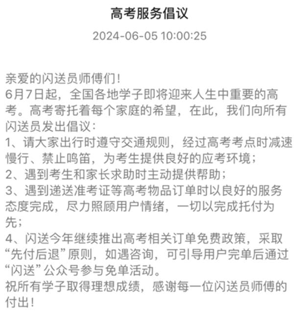 此外,閃送也向全國超過255萬閃送員發(fā)出倡議,號(hào)召騎手在高考期間文明騎行,主動(dòng)向考生和家長(zhǎng)提供幫助,用最好的精神面貌服務(wù)用戶,為高考加油。