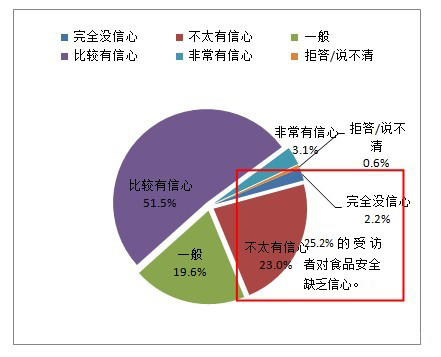 雖然,今年市民對食品安全比較有信心,但是食品安全問題現狀仍不可忽視,其中25.2%的市民對食品安全缺乏信心,51.5%的市民比較有信心,僅3.1%的市民非常有信心。