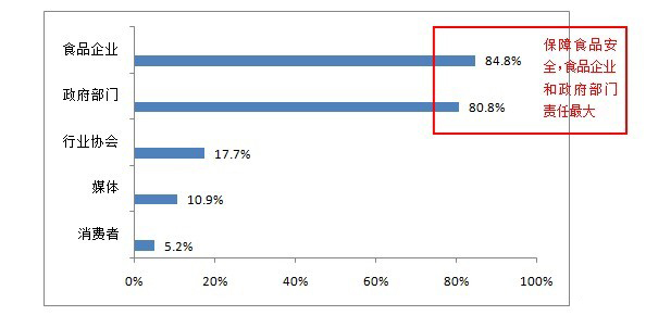 在保障食品安全的責任問題上,84.8%的市民認為食品企業責任最大,80.8%的市民認為政府部門責任最大,行業協會、媒體、消費者也被認為負有一定的責任,但比重較小,分別為17.7%、10.9%和5.2%。